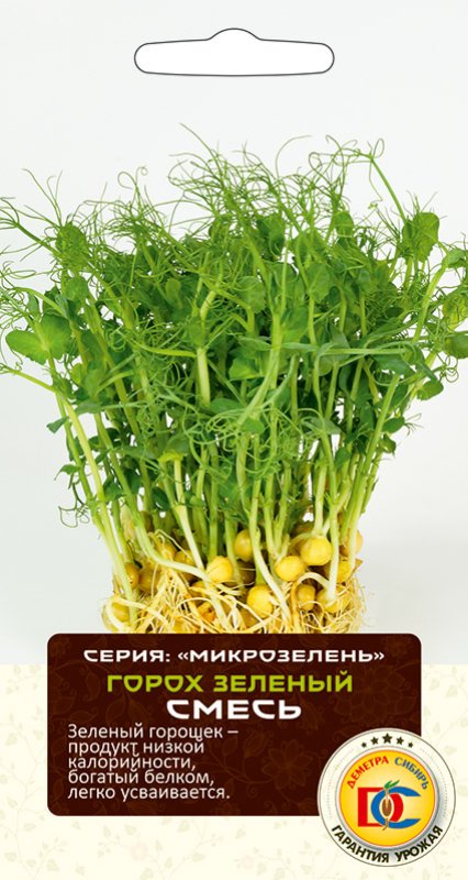 Проростки гороха обладают удивительным, нежным вкусом, напоминающим свежий зеленый горошек. Микрозелень гороха, в отличие от семян, – пища, которая легко усваивается организмом. Благодаря наличию минералов, микроэлементов, а также витаминов группы В – это отличный ингредиент диетических и вегетарианских блюд. Микрозелень обладает сочным, сладковатым вкусом. Употребляется в свежем виде, отлично подходит для добавления в салаты, для украшения блюд и десертов.Эта необычная микрозелень состоит из сортов овощного гороха: горох овощной (Pisum sativum L.) Алтайский изумруд, Ранний 301, Первенец . АГРОТЕХНИКА: В качестве субстрата для выращивания используют грунт для рассады, песок, перлит, бумажные салфетки. Закладывают материал в низкую широкую емкость, увлажняют. Семена равномерно распределяют по поверхности и присыпают тонким (1 мм) слоем песка. Накрывают емкость стеклом (пленкой) и держат на свету при комнатной температуре. В фазе одной пары настоящих листочков микрозелень срезают ножницами. Посевы проводят круглогодично.
