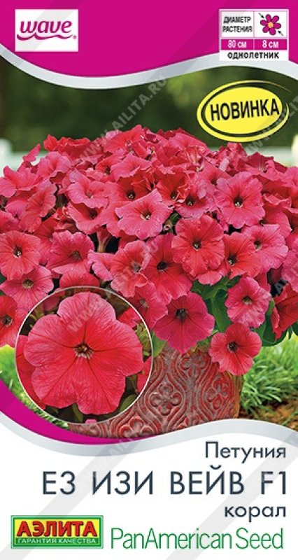 Инновационная эксклюзивная серия американской селекции «Е3 Изи вейв F1». Эти петунии объединили в себе лучшие свойства ампельных, крупно- и многоцветковых разновидностей культуры, что ранее казалось недостижимым. Растение образует очень густой полураскидистый куст диаметром 60-80 см (при высоте 15-30 см). Благодаря целенаправленной селекционной работе цветение гибридов наступает уже при длине дня 9,5 часов и длится до устойчивых осенних заморозков, что значительно сокращает общие затраты при благоустройстве. Насыщенная цветовая гамма крупных цветков (диаметром 6-8 см), необычная полуампельная форма, однородность и выносливость этих растений оставляют позади всех конкурентов. Серия одинаково роскошно выглядит в вазонах и подвесных кашпо, в виде ковровых посадок в цветниках.