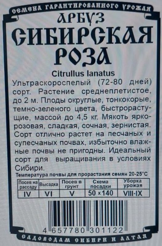 Ультраскороспелый (72-80 дней) сорт. Растение среднеплетистое, до 2м. Плоды округлые, тонкокорые, темно-зеленого цвета, быстрорастущие, массой до 4,5 кг. Мякоть ярко-розовая, сладкая, сочная, зернистая. Сорт отлично растет на песчаных и супесчаных почвах, избыточно влажные почвы не пригодны. Идеальный сорт для выращивания в условиях Сибири.