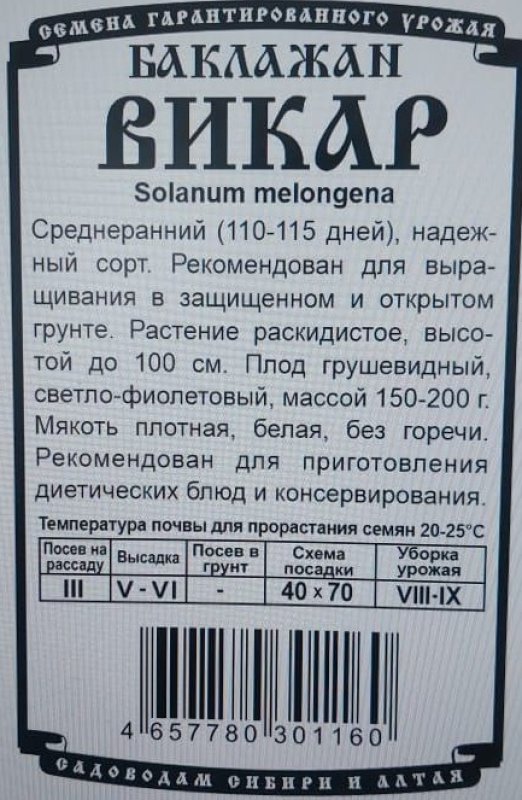 Среднеранний (110-115 дней), надежный сорт. Рекомендован для выращивания в защищенном и открытом грунте. Растение раскидистое, высотой до 100 см. Плод грушевидный, светло-фиолетовый, массой 150-200г. Мякоть плотная, белая, без горечи. Рекомендован для приготовления диетических блюд и консервирования.